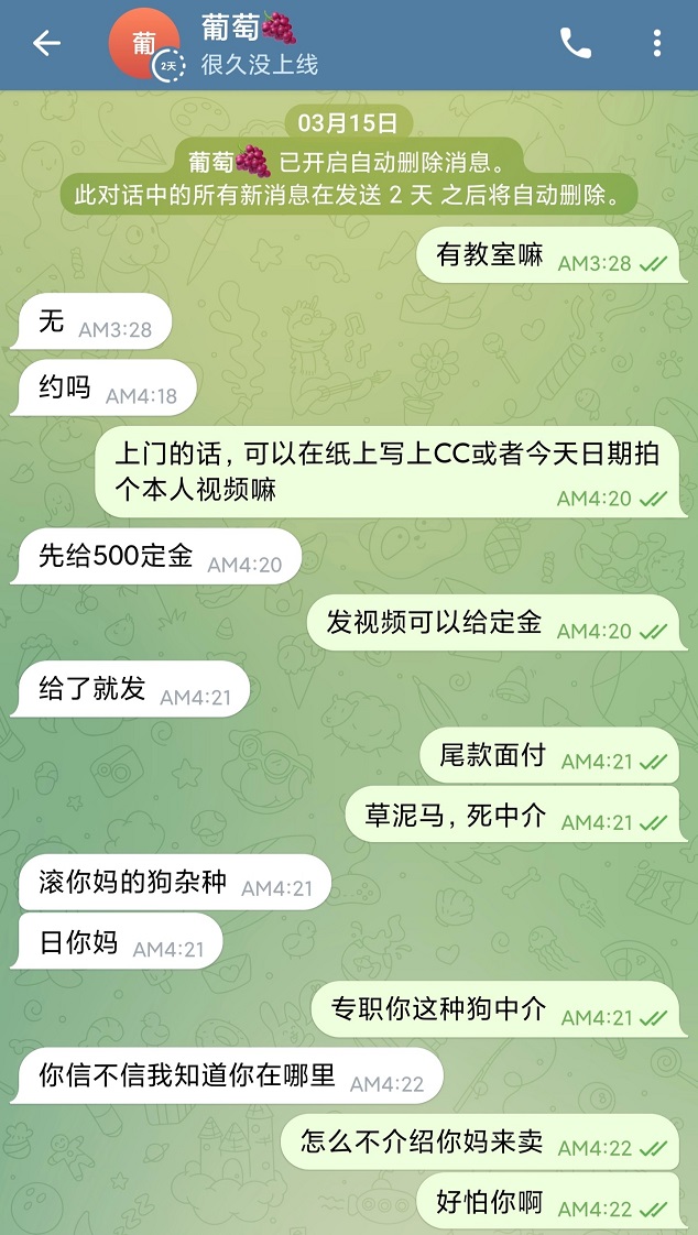 当你转了定金,对方会说:“你是第一次来,为了保证技师安全,防止你是便衣,需要支付1000-3000元保证金(承诺服务完退还)。”